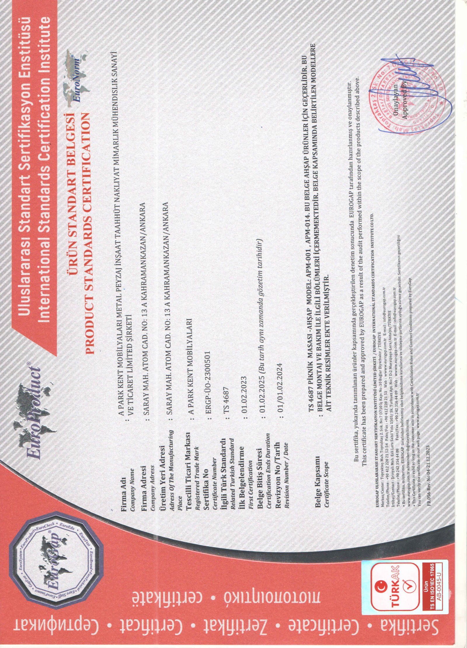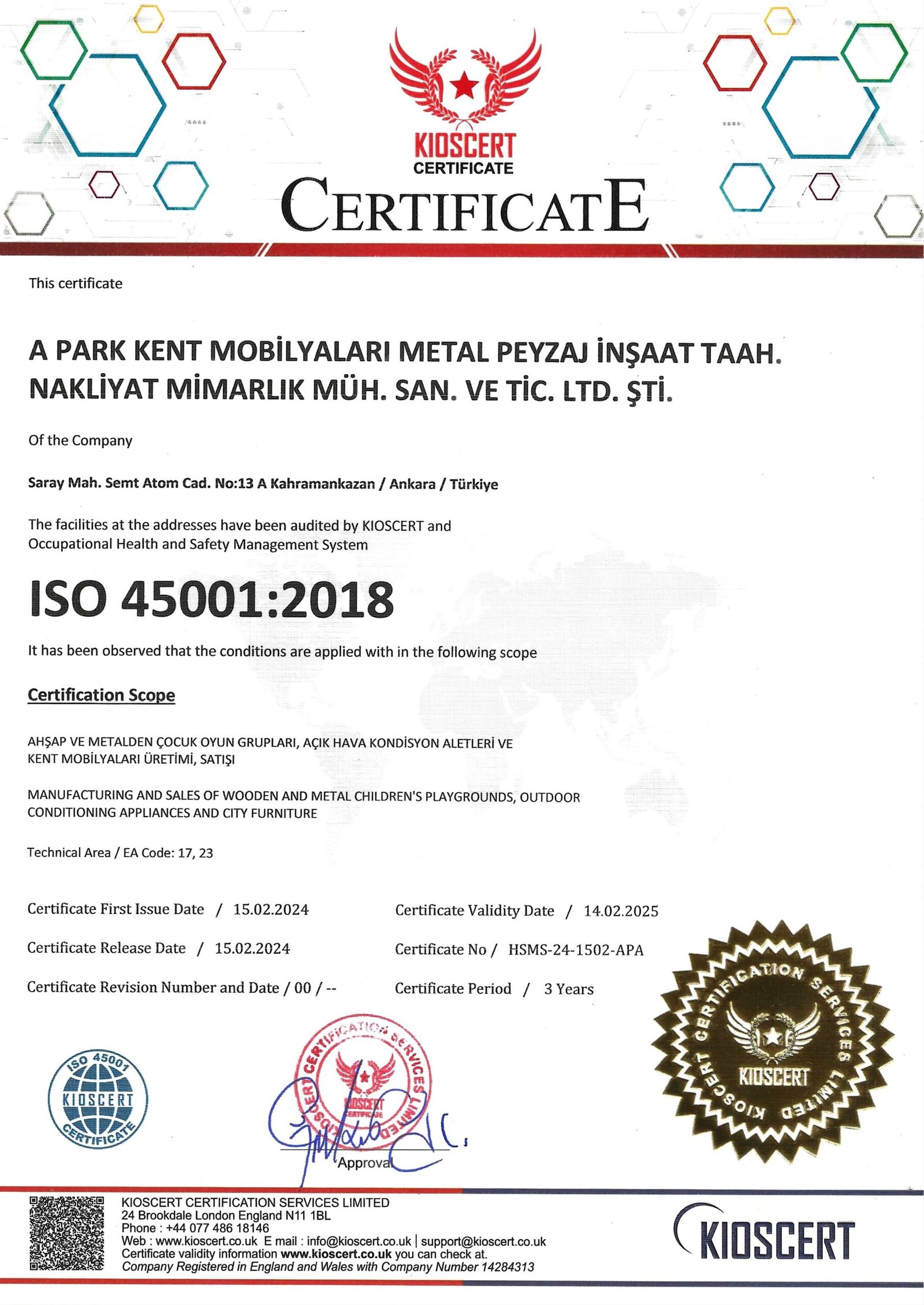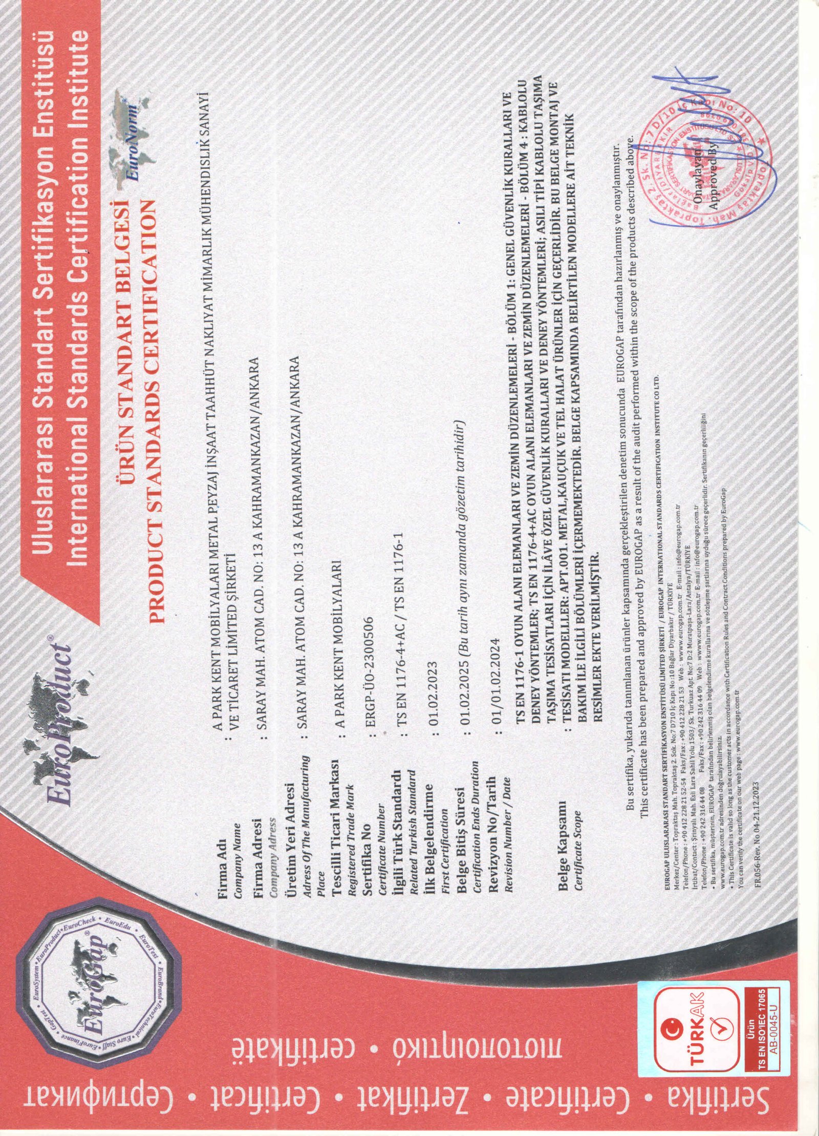 Firmamız; ISO 9001:2015 Kalite Yönetim Sistemi, ISO 14001:2015 Çevre Yönetim Sistemi, OHSAS 18001:2007 İş Sağlığı ve Güvenliği Yönetim Sistemi EN 1176-1 Çocuk Oyun Alanları Elemanları/ Genel Güvenlik Kuralları EN 1176-2 Çocuk Oyun Alanları Elemanları/ Salıncaklar için gerekli Güvenlik Kuralları EN 1176-3 Çocuk Oyun Alanları Elemanları/ Kaydıraklar için gerekli Güvenlik Kuralları EN 1176-4 Çocuk Oyun Alanları Elemanları/ Teleferik için gerekli Güvenlik Kuralları EN 1176-5 Çocuk Oyun Alanları Elemanları/ Dönme Dolap için gerekli Güvenlik Kuralları EN 1176-6 Çocuk Oyun Alanları Elemanları/ Zıpzıp-Tahterevalli için gerekli Güvenlik Kuralları EN 1176-11 Çocuk Oyun Alanları Elemanları/ Havada Asılı Ağlar için gerekli Güvenlik Kuralları EN 16630 Dış Mekan Spor Aletleri için gerekli Güvenlik Gereklilikleri ve Test Metodları EN 16630 Dış Mekan Spor Aletleri için gerekli Güvenlik Gereklilikleri ve Test Metodları TS 13735 Çöp Kovası TS 13858 Kameriye TS 7941 Oturma Bankı TS 13548-TS 12427 HİZMET YETERLİLİK Belgelerine sahip olup bu sistemler için gerekli olan tüm prosedürler uygulanmaktadır.